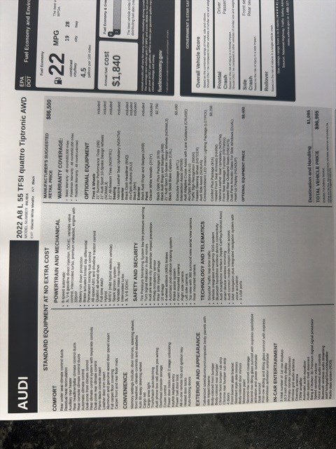Glacier White 2022 Audi A8 L 55 3.0L V6 Turbocharged DOHC 24V LEV3-ULEV70 335hp 8-Speed Automatic with Tiptronic quattro Black Leather, 20 10-Parallel-Spoke-Design Wheels, 22-Way Heated Multi-Contour Comfort Front Seats, Alu-Optic Buttons, AM/FM radio: SiriusXM, Audi Adaptive Cruise Assist w/Lane Guidance, Audi Side Assist, Audi smartphone interface (Apple CarPlay/Android Auto), Auto High-beam Headlights, Auto tilt-away steering wheel, Auto-dimming Rear-View mirror, Bang & Olufsen Sound System w/3D Sound, Brake assist, Comfort Plus Package, Contour/Ambient LED Interior Lighting Package, Delay-off headlights, Dual-Pane Acoustic Glass for Side Windows, Electronic Stability Control, Executive Package, Front Bucket Seats, Front fog lights, Front Seat Massage Function, Head restraints memory, Head-Up Display, Headlight cleaning, Heated Front Seat Armrests, Heated front seats, Heated Rear Outboard Seats, Heated Steering Wheel, Intersection Assist, Memory seat, Navigation system: MMI Navigation plus, Power 2nd-Row Moonroof, Power adjustable front head restraints, Power driver seat, Power moonroof, Power steering, Power windows, Radio data system, Radio: Audi MMI Navigation Plus, Rain sensing wipers, Rear fog lights, Remote keyless entry, Seatbelt memory, Speed-Sensitive Wipers, Steering wheel memory, Steering wheel mounted audio controls, Traffic Sign Recognition, Valcona Leather Seat Upholstery, Valetta Leather Seat Upholstery, Variably intermittent wipers, Ventilated front seats, Wheels: 21 Audi Sport 10-Spoke Design.